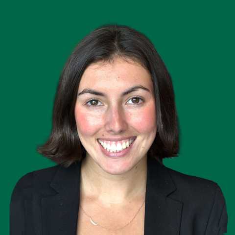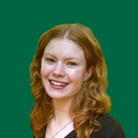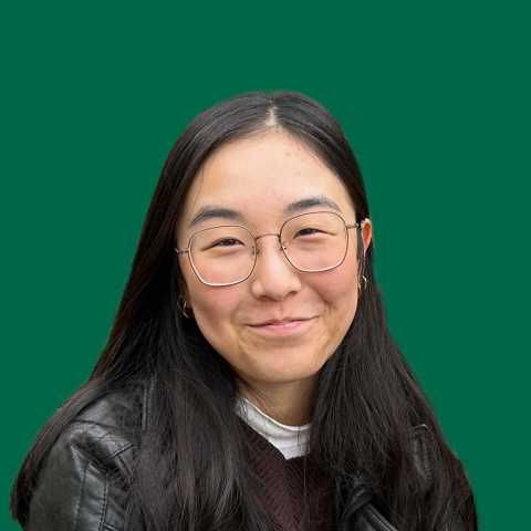 An illustration of an abstract blue figure holding two lightbulbs joyfully, in front of a bright green background.