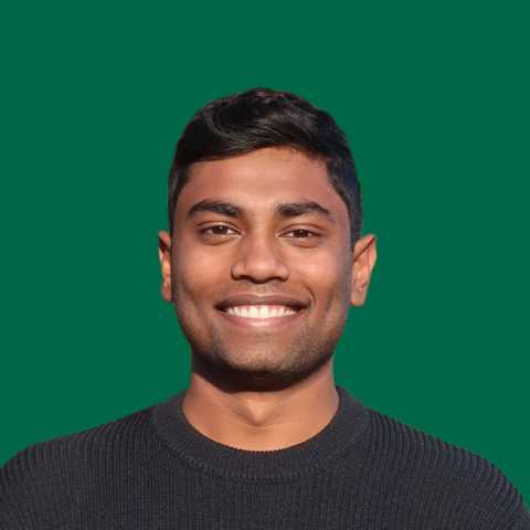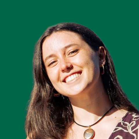 An illustration of an abstract blue figure holding two lightbulbs joyfully, in front of a bright green background.